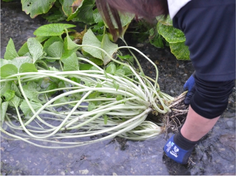安曇野は北アルプスの伏流水が平野部に湧き出るため、平地での栽培が可能になる「沢わさび」という栽培方法が主流です。地面を2メートルほど眠って畑の体をなし、敵を作って小石を敷き詰めます。水は常に一定の水量が確保されており、その水量は安曇野全体で1日に70万トンと言われています。この豊富な伏流水こそ安曇野山葵の栽培を支える資源なのです。